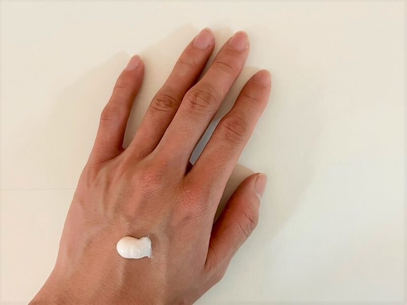 左手に適量をのせて右の手のひらでやさしくなじませながら、手の甲から指先までまんべんなく塗布。