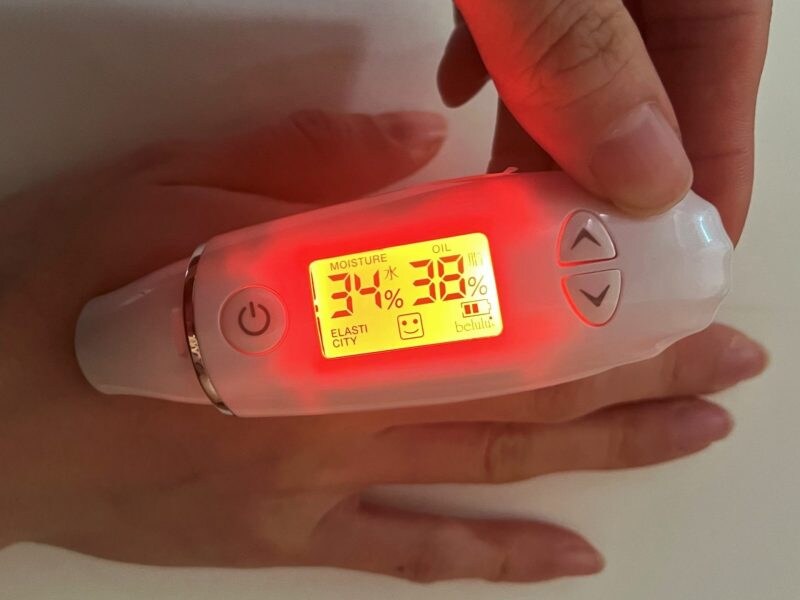 今回は、ライトの色によって肌の調子がひと目でわかるスキンチェッカーを使用。「非常にいい(グリーン)」、「普通(オレンジ)」、「よくない(レッド)」の3段階で診断します。