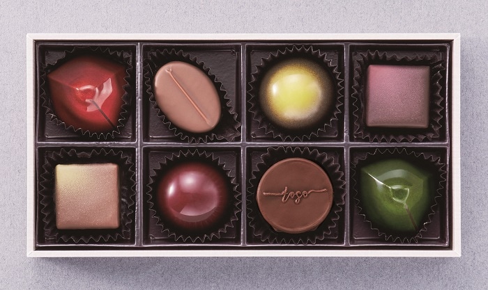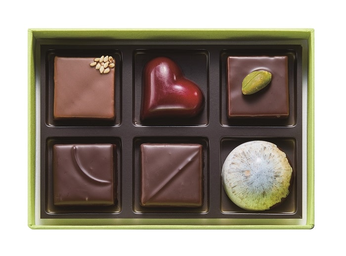 口どけ重視の独自製法で作られた新作を含む6種のショコラを詰め合わせた「リブアソート」は、ゴマ、フランボワーズ、ピスタチオなど素材の味わいを実直に引き出した一品。