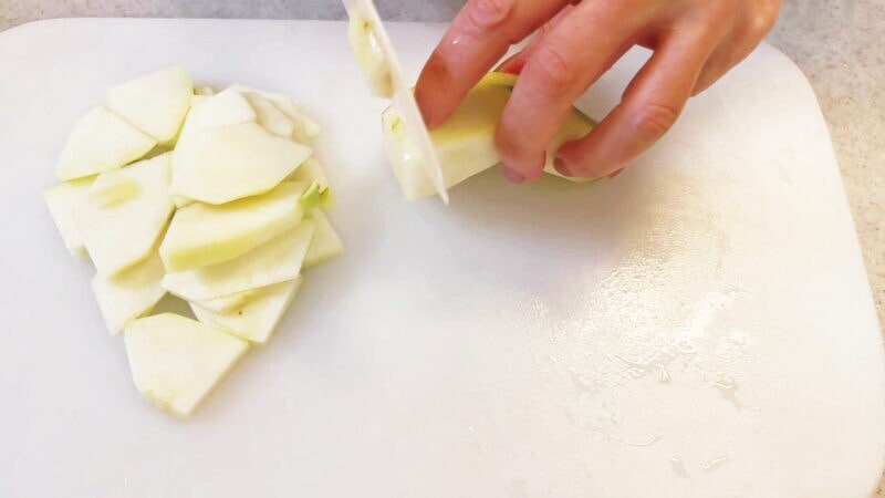 ラフランスをホタテと同じくらいの厚さ(約5 ~ 7mm)に切ります。ラフランスはさわやかで控えめ、まるで上戸彩さんですね。