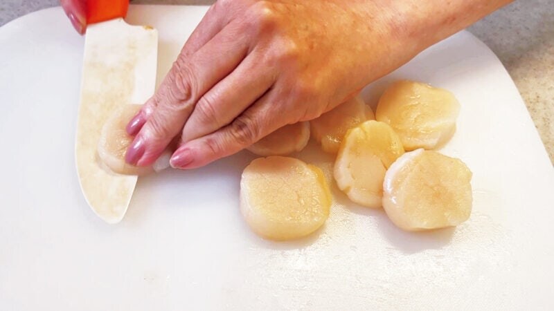 ホタテは厚さ半分にそぎ切りにしていきます。もう少し薄く、1/3のそぎ切りにしてもいいですよ。