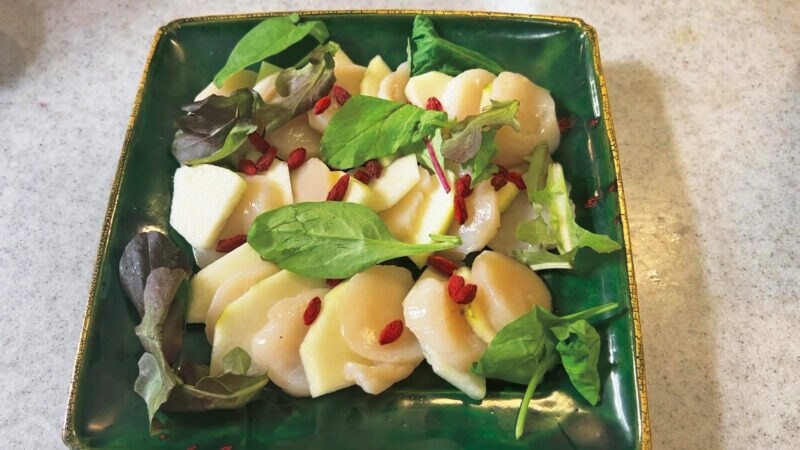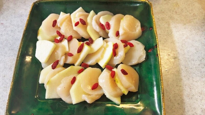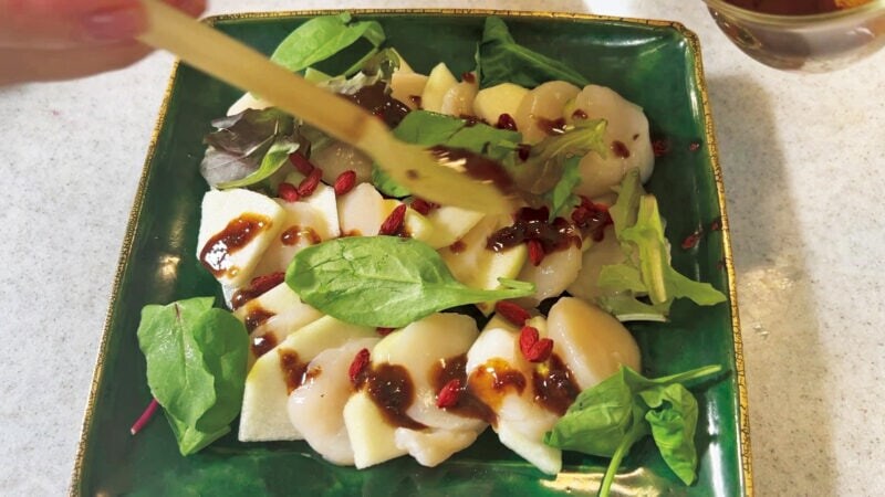 クコの実を散らします。和のホタテ、洋のラフランス、中華のクコということで、和洋中が仲良く勢ぞろい。世界中が平和になればいいなと思います。