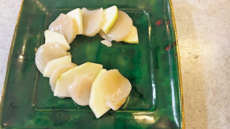 ラフランスは梨よりもホタテと近い食感というか、やわらかさがありますので、梨でもいいのですが今回はラフランスを選んでみました。歯触りが近いと、それだけですごくおいしいんですよね。
