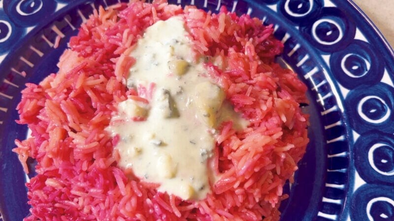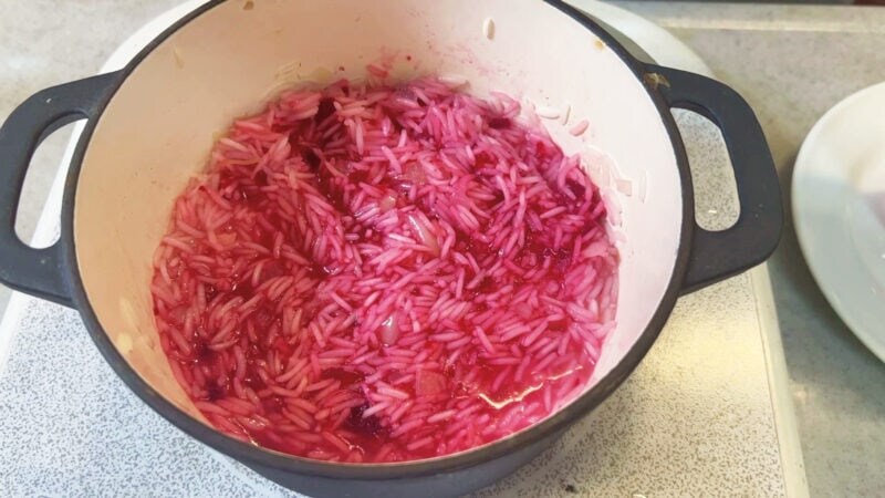 (昆布だしがライスに吸われるまで煮込んだら)ビーツの汁と、ミキサーでつぶしたビーツを入れます。ご覧ください、このピンクのきれいなこと! もうなんだか、おめでたい感じがしてまいります。まんべんなく混ぜたらふたをして、炊き込みます。