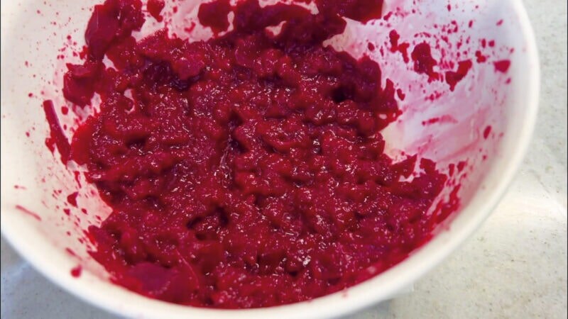 水煮の汁は分けておきます。ビーツはかぶのように使えますね。赤い色が鮮明なので、料理の彩りを華やかにします。実のほうは包丁でほどよく小さく切って、フードミキサーなどで(写真くらいまで)つぶします。