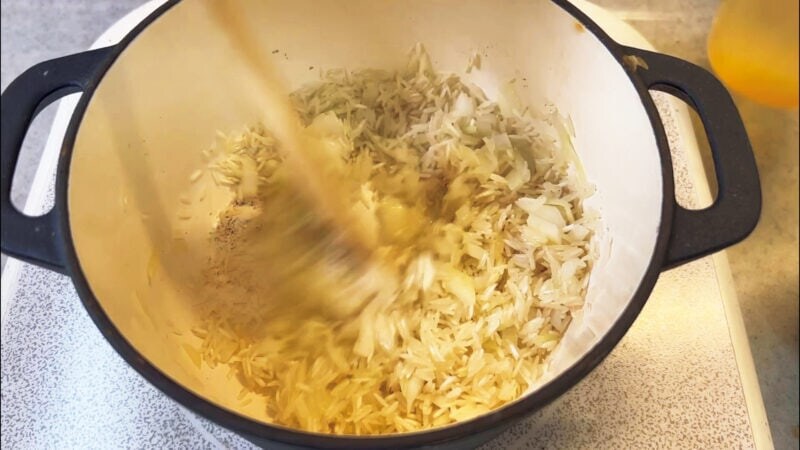 ほどよく炒めたライスに昆布だしを入れて煮込みます。