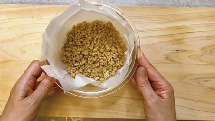 砕いておいたクッキーを型にのっけておきます。