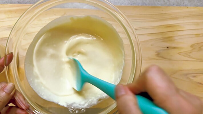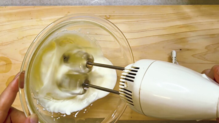 (別のボウルに)生クリームを泡立てていきます。