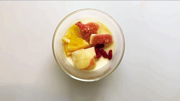 うちの場合は残っていたイチジク、蜂蜜漬けのレモン、桃、そして杏仁豆腐の赤いヤツと言えば、クコの実でございます。