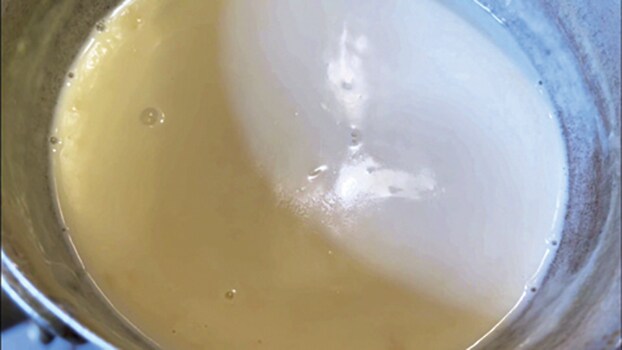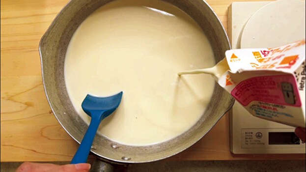 そこに豆乳を投入します。さらには生クリームも入ります。