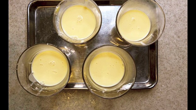 (杏仁液の)粗熱が取れたところで、グラスの中に入れて冷やしていきます。