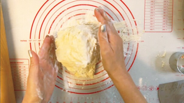 (ボウルに小麦粉・砂糖・塩・ベーキングパウダーを入れ、泡立て器でまんべんなく混ぜたあと、よく冷えたバターを粉に入れ、ドレッジなどを使ってバターを切るように細かくし、ある程度細かくなったら、手の熱でバターが溶けないように注意しながら、粉チーズ状のポロポロした状態になるまで混ぜる。つぎに牛乳を入れて混ぜる。手で折りたたむようにしてまとめていき、粉っぽさがなくなってひとまとまりになったのが、写真の状態。のばす前の打ち粉をしています)