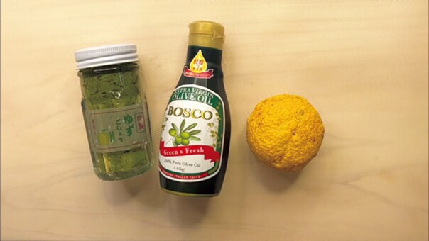 柚子胡椒、オリーブオイル、いただきものの柚子が手に入りました。