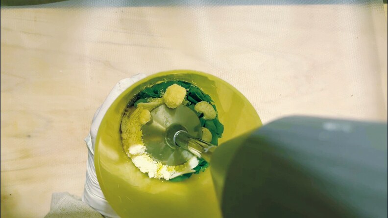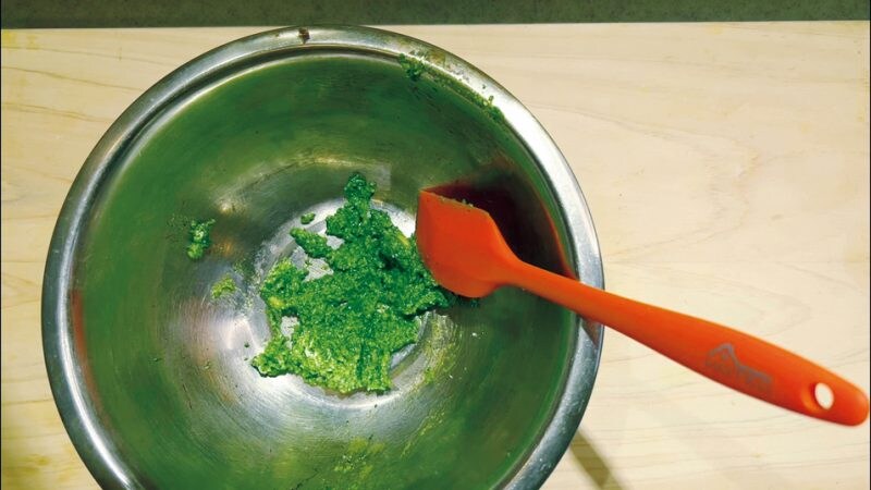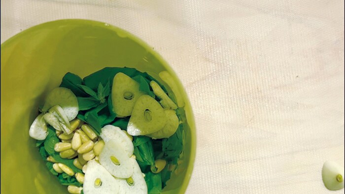 私が旅先で作ろうとしたとき松の実がなかったんですけども、クルミで代用したら悪くなかったです。さらに、にんにく1かけくらい、大きい場合は半分くらいでもいいですが、薄切りにして入れます。