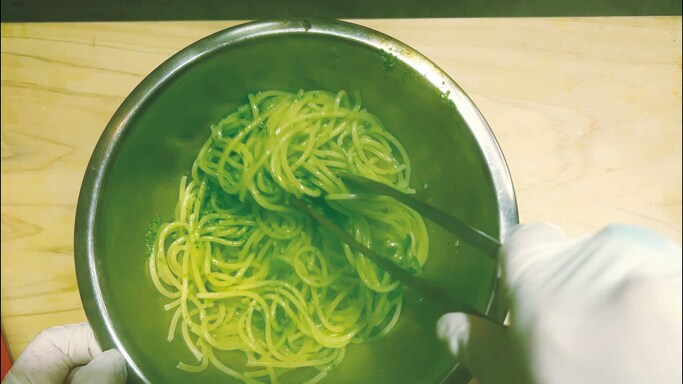 パスタをしっかり湯切りして、ソースにあえていきます。