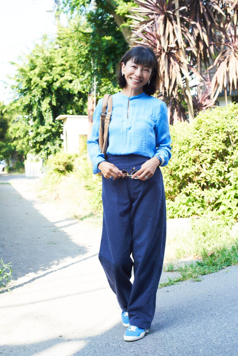 やわらかな質感のレーヨンシャツ×ワイドパンツは、「ゆるっとして気持ちがいい」と山根さん。ワントーンにまとめるとマニッシュさが際立ちます。