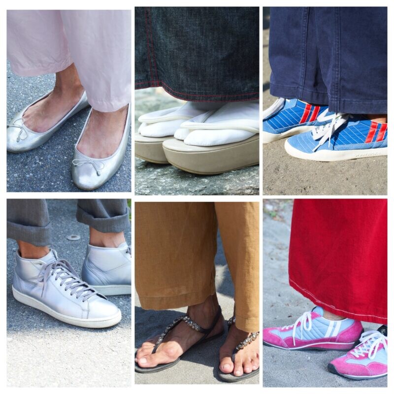 スポーティミックスのコーデには、フランス発のパトリックが映えます。「デザインやはき心地がいいので、スニーカーはパトリックがメイン」と山根さん。きれいめのコーデには、シルバーのバレエシューズを合わせます。デニム着物には、京都の老舗が発信するモダンテイストの草履を。