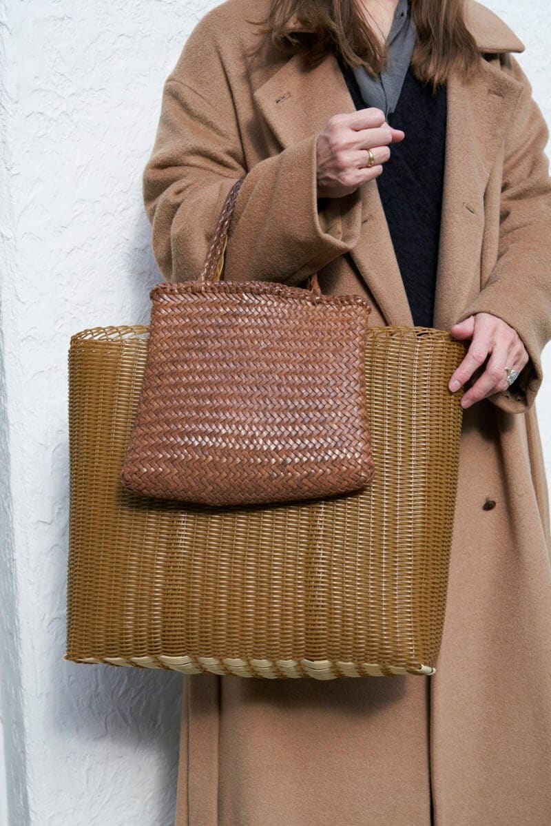 茶花のお稽古の日は花材を持ち帰るので大きめのバッグがマスト。「リサイクルプラスチックのかごバッグは、水にぬれても気にならないので便利です。小さいほうのドラゴンのレザーの編みバッグは、どんなコーデにも合わせやすく、一年中持っています」(清水さん)。大小のバッグを2つ持ちすると、スタイリングにリズムが生まれて軽快な印象に。