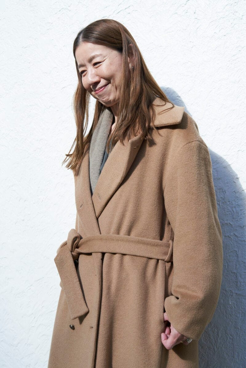 ふだんはボタンを外してこなれた感じにはおりますが、日がかげってきたら前を閉じてラフにベルトを結びます。暖かくてきちんと感がアップします。