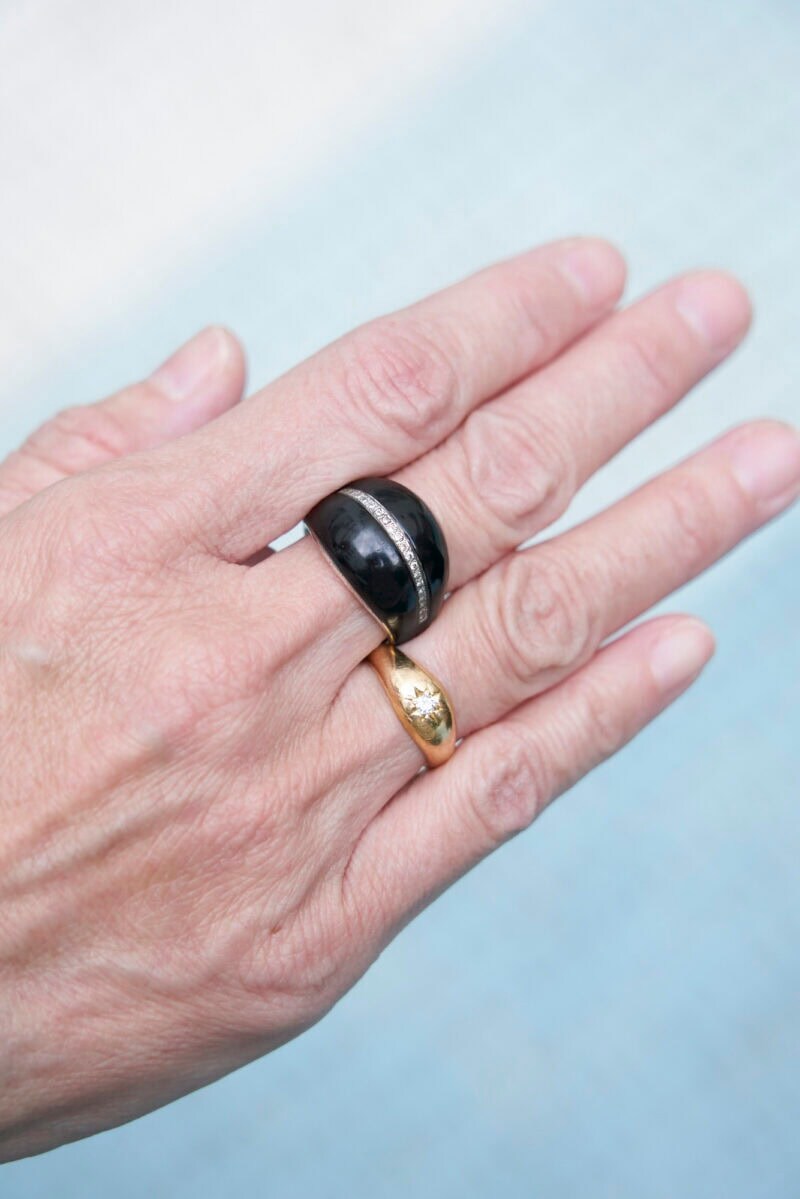 「ひいおばあちゃんのダイヤ入りゴールドリングは御守りです。中指に付けたメゾンルーバスのエナメルとダイヤのリングもお気に入りでよくつけています」と清水さん。