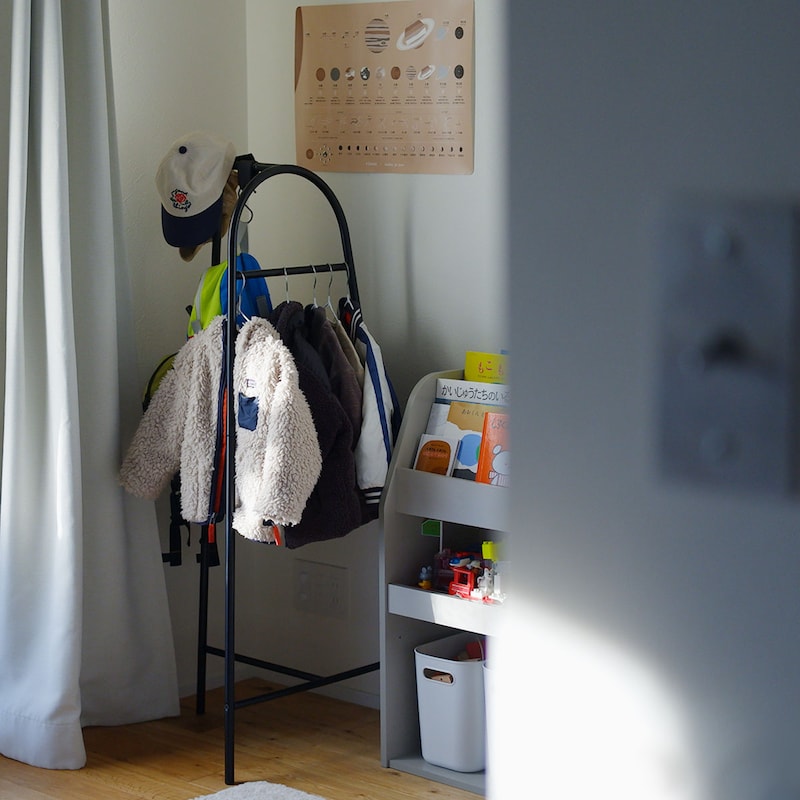 子どもの洋服とはいえ、アウターは厚みがあって嵩張るもの。ポールハンガーでは奥に埋もれていた洋服も、コートハンガーならきちんと見渡せて“肥やし“にしません。