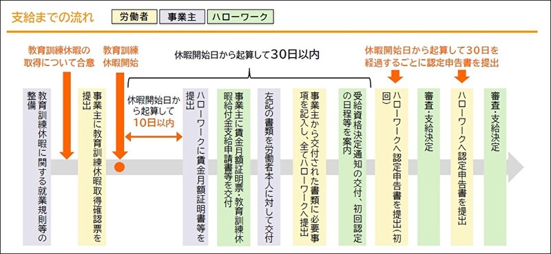 労働者は事業主の合意を得たうえで、「教育訓練休暇取得確認票」を提出する。その後、教育訓練休暇の開始日から起算して10日以内に、事業主がハローワークに賃金月額証明書等を提出しなければならない。