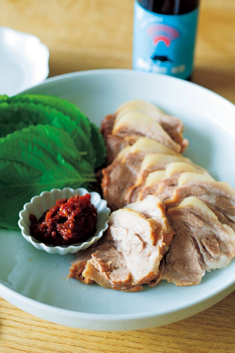 5. 3を食べやすく切って器に盛り、えごまの葉と4を添える。3で残ったゆで汁で麺をゆで、万能ねぎの小口切りをのせて食べるのもおすすめ。