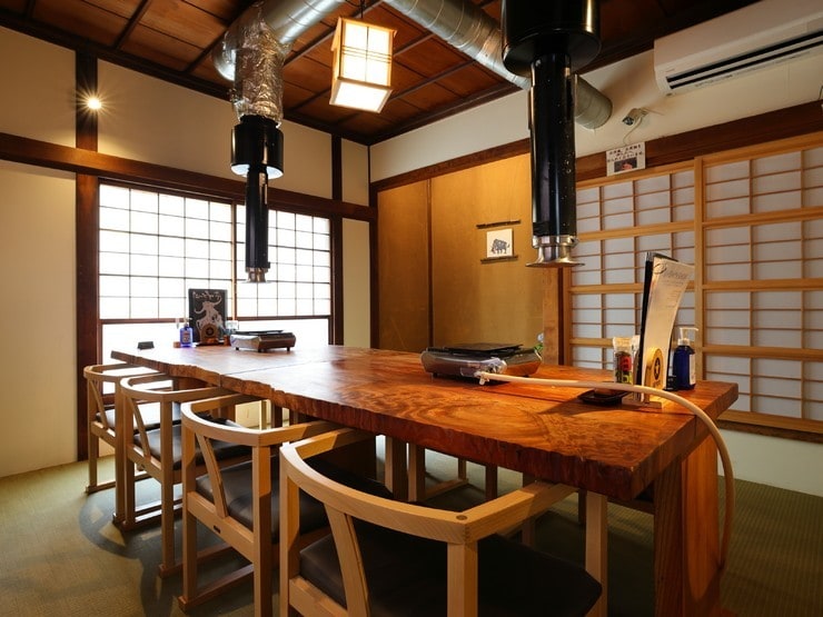 古民家をリノベーションしたお店には2つのフロアがあり、座敷席や個室、カウンター席など、さまざまな席タイプがあります。店内のBGMは80~90年代のJ-POP、懐かしさと落ち着きを感じる空間です。ワインや日本酒、焼酎、サワーといったドリンク類も豊富に取りそろえられていて、お肉に合わせてセレクトすることができます。