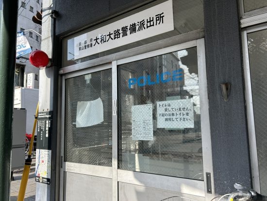 八坂神社前から続く大和大路通り。コンビニだけでなく交番も「トイレは貸していません」との貼り紙を掲げていたもう一つの異変が、路上沿いにあるコンビニの掲示だ。「店内にトイレはありません」「トイレはご利用いただけません」ーー多くのコンビニが、「トイレ貸出拒否」の貼り紙を店内外に掲げているのだ。東山区内で10数軒の店舗をまわってみたが、8~9割は貸出不可。中には配送用の箱をトイレ前に重ね、バリケードを作っている店もあるほどだった。