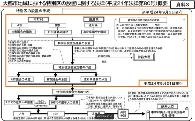 具体的には、各市と都道府県の議会議決に基づき『特別区設置協議会』を設置し、そこで審議を行って『特別区設置協定書』を作成し、各自治体の議会の審議・承認を得た上で、住民投票にかけるというものです(【図表】参照)。