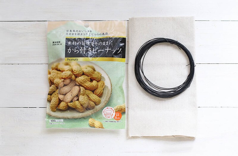 100均の食品コーナーで売られていたピーナッツと、以前100均で買った針金、それからハギレです。