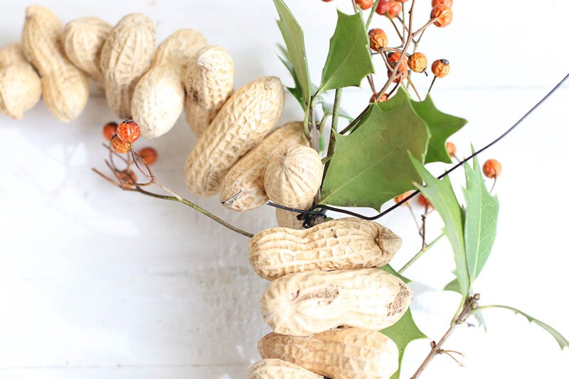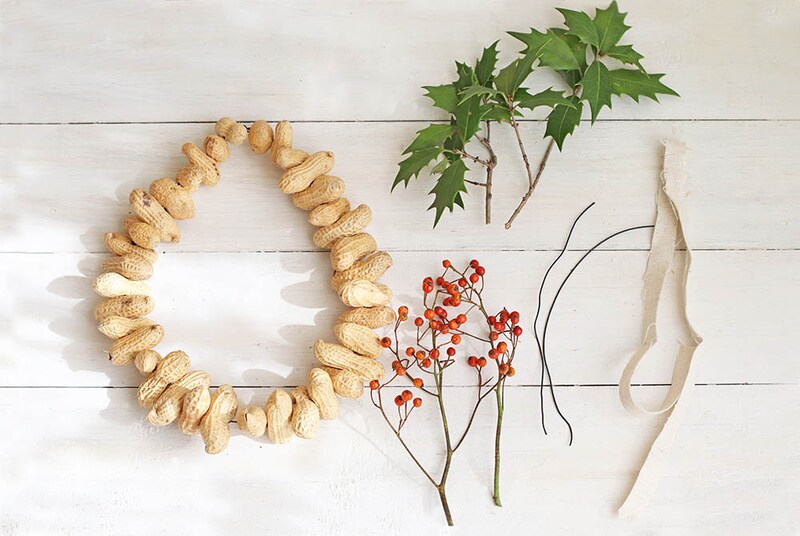 落花生リースの上に、ヒイラギと野バラの実を置いて、場所やバランスを確認します。