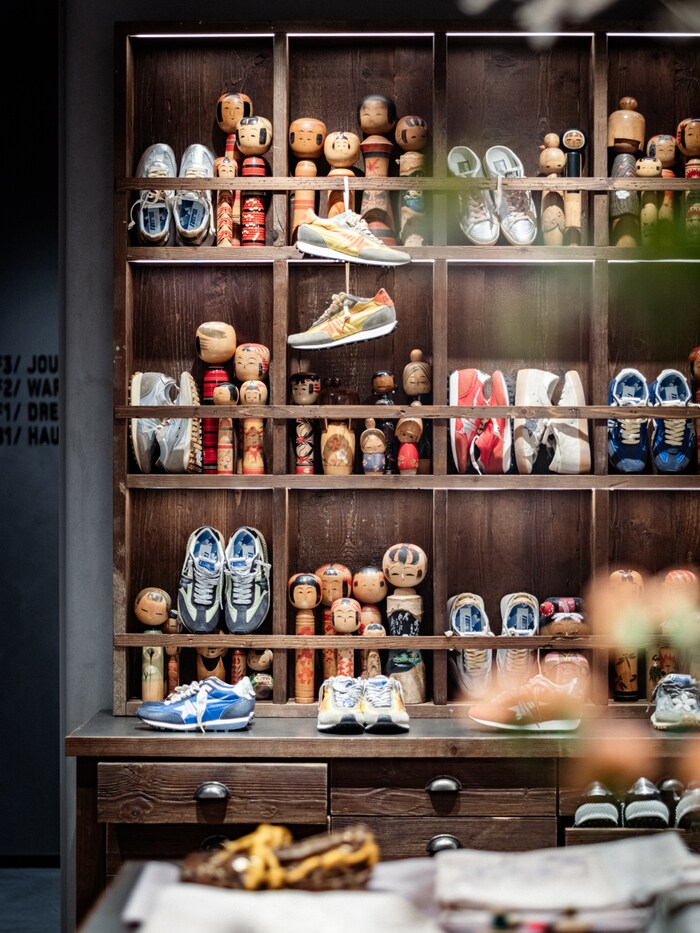 カンパラ氏の言葉通り、店内にはお客さんが主役になるための仕掛けがいくつもある。ディスプレイのユニークさもそのひとつだ。たとえば、日本の伝統工芸品であるこけしと、「ゴールデングース」のアイコン的存在のスニーカーがラックの中で一緒に並んでいたり、ダンボールの中にスニーカーがたくさん詰まっていたり。歩いているだけで、おもちゃ箱をのぞいてお気に入りのものを見つけるようなワクワク感がある。