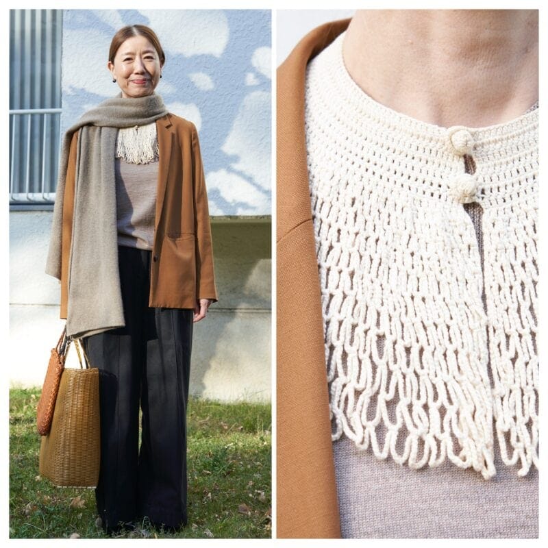 シンプルなラウンドネックのニットに、アンティークショップでひとめ惚れしたつけ衿をプラスすると、たちまちおしゃれ度アップ!「渋谷のアンティークショップで最近買いました。大好きなキャラメル色やベージュのニットにつけると、気持ちも華やぎます」と清水さん。ていねいな手仕事のレースとボタンがロマンティックです。