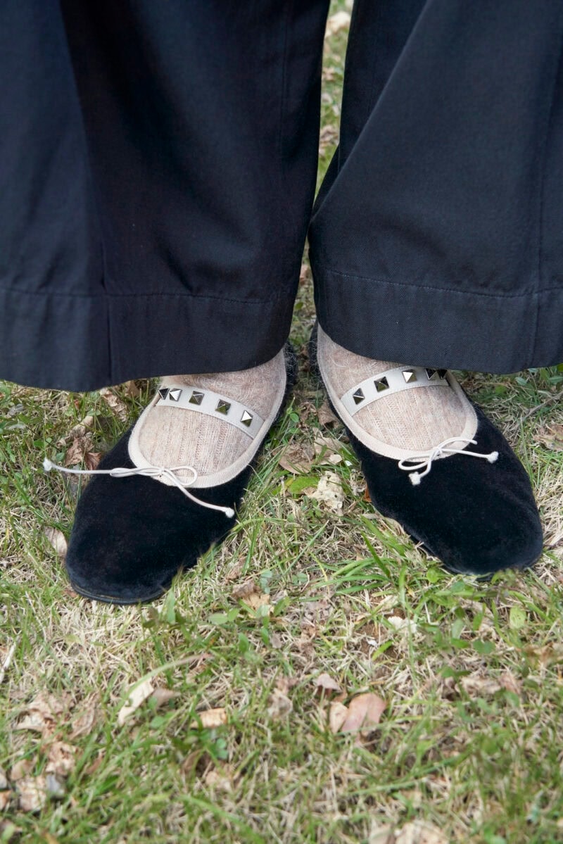 スタッズがおしゃれなベロアのバレエシューズは、大人の遊び心を満たします。「かっちりしすぎず、はき心地もいいです」と清水さん。伸縮性のあるストラップがついていて、甲が浅めでも脱げづらいデザインです。