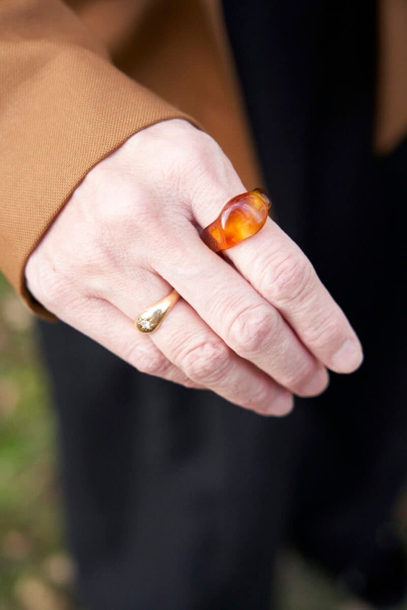 薬指には曾祖母の形見のゴールドとダイヤのリングをはめ、人差し指にはべっこう風のリングをつけました。「韓国で出合ったガラスリングが素敵で、一昨年企画展をしました。一見べっこうや翡翠(ひすい)のようでガラスという16色のリングの企画展は大好評で、今年の夏に再びガラスリングの企画展を予定しています」(清水さん)