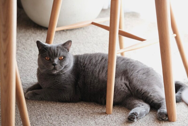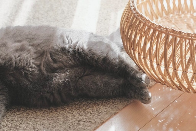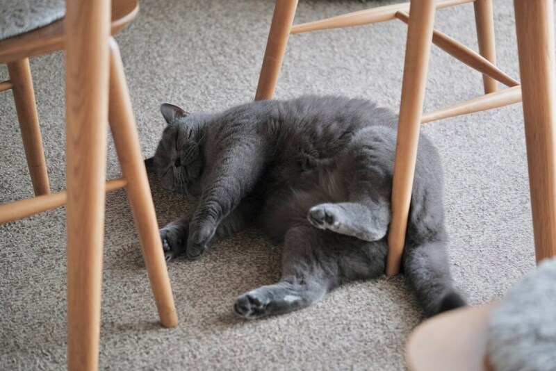 椅子の下でひなたぼっこ。日当たりがよくて、ぽかぽかです。椅子の足に囲まれるのも、まるで森の中にいるみたいで落ち着きます。