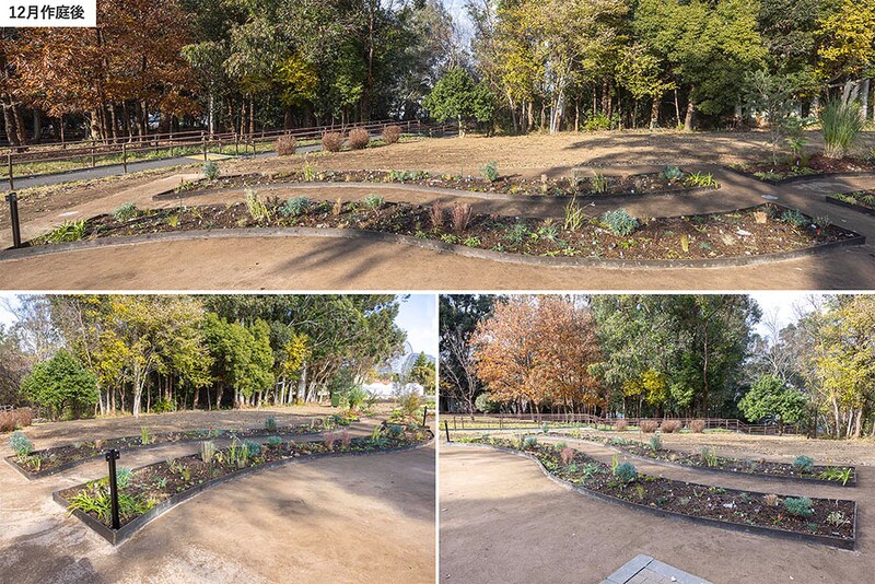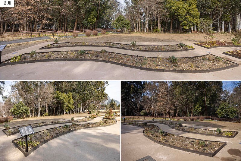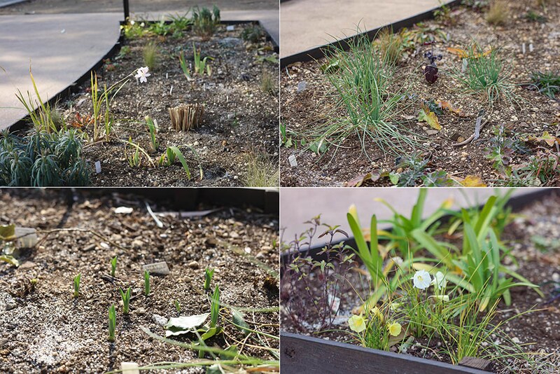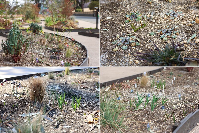 まだ寒々しさの残るガーデンの中で、チューリップやスイセン、クロッカスの芽が、艶やかな緑の彩りを添えています。成長前のグラス類やロゼット状の植物などが休眠している姿には、地味ながらも、どこか味わいが感じられます。