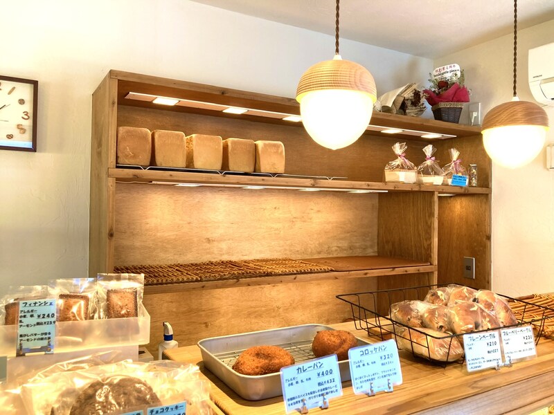 暖かみのあるライトが下がっていて、奥の木の棚に食パンが並んでいました。