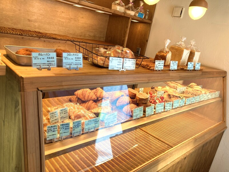 お店に入ると、木の温もりを感ずるショーケースにパンが並んでいます。