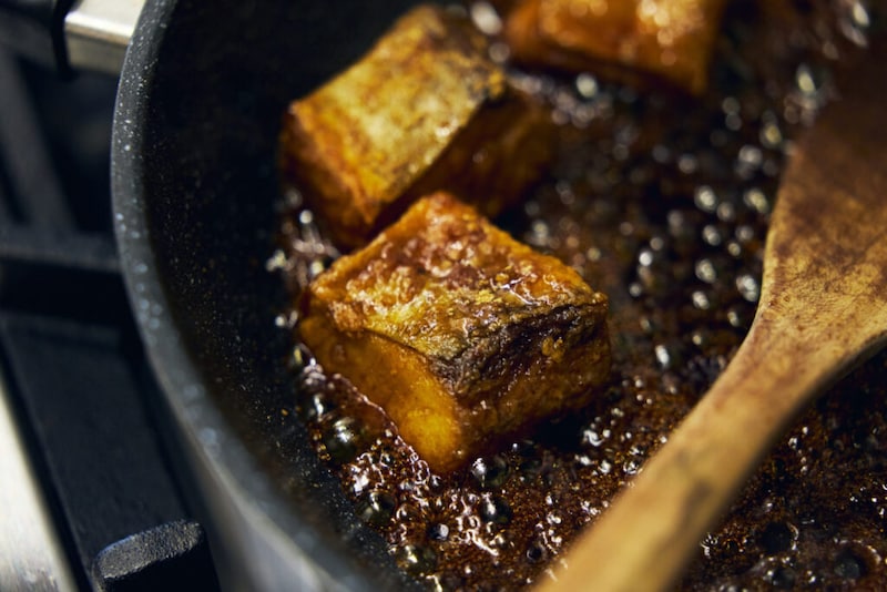 揚げている間に、フライパンに黒酢、砂糖、酒、みりん、水を入れて、タレの準備を。鰆が揚がったらフライパンを弱火〜中火の間で温め、タレがふつふつとしてきたところで鰆と合わせます。このとき、できるだけ木べらで鰆を触らずに、フライパンをあおってタレを絡めることで、身がふっくらした仕上がりになります。最後に花椒パウダーをまぶしたら完成です。