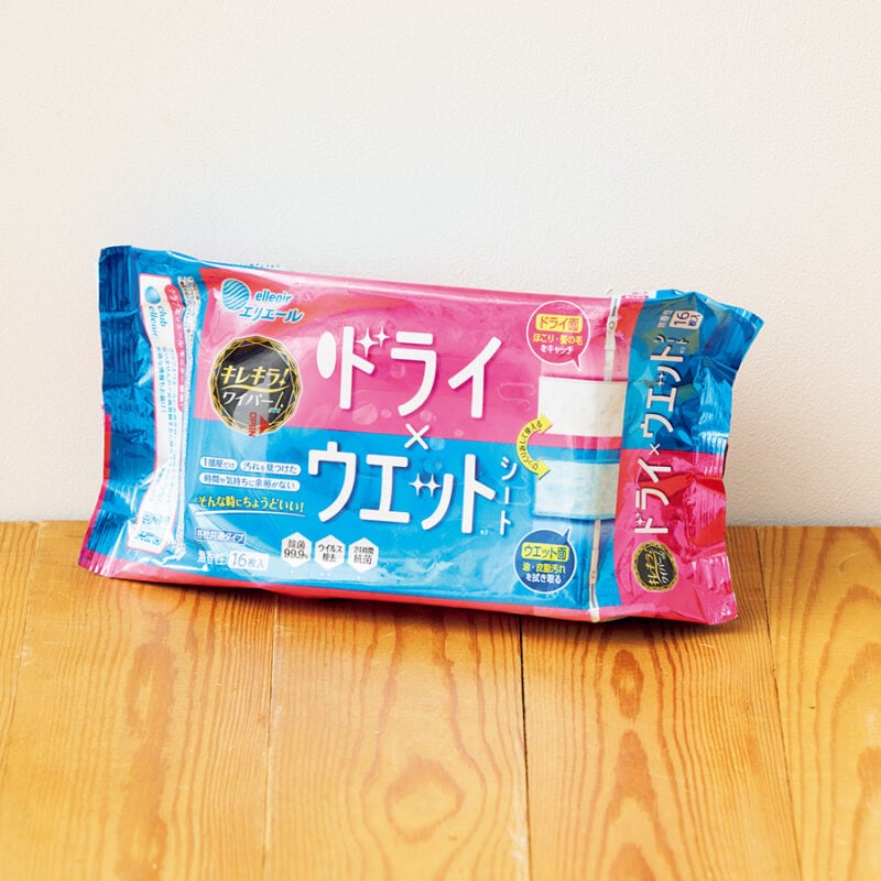 ドライ面とウエット面が表裏一体化したワイパーシート。ドライ面でホコリや髪の毛をキャッチし、ウエット面でべたべた汚れをオフ。
