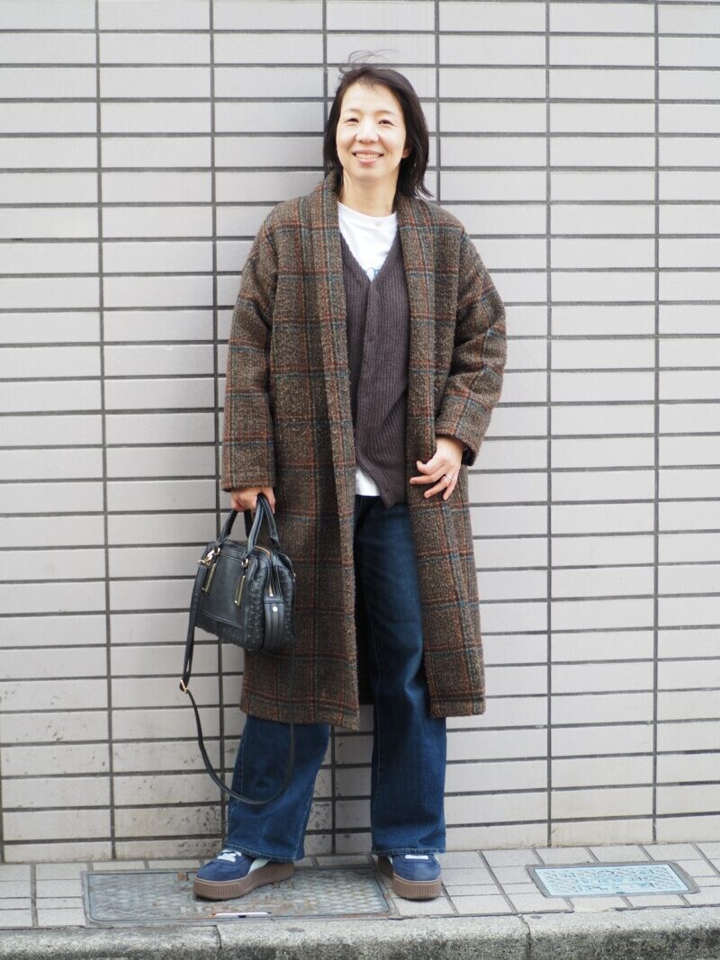 爽やかな白いTシャツにカーディガンを重ね、同系色のコートをオン。トレンドのブラウンを基調としたチェック柄が季節感を高めています。ほどよくゆとりのあるデニムを合わせて、リラックスムードに仕上げて。
