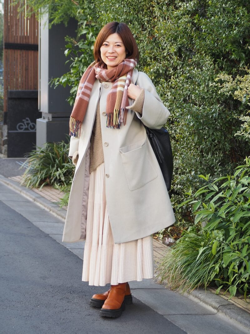 コーディネートの主役は、重くなりがちな冬の着こなしが爽やかになるミントグリーンのロングコート。細かなプリーツが揺れるスカートが、Yukariさんの可愛らしい雰囲気にベストマッチ。淡い色合いでまとめつつ、チェックストールで季節感をプラス。やさしげな印象に仕上がる配色バランスがお見事です。