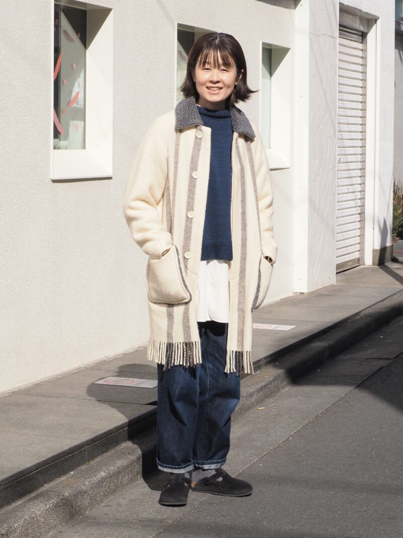 8年ほど前に購入したという「フィルメランジェ」の羽織りは、ボア素材の衿やフリンジのあしらいなど、細部へのこだわりを感じるアイテム。「ゴットランドシープのウールを100%使用していて、薄手ですがとても暖かいです」。ネイビーのニットと同系色のデニムでトーンを合わせつつ、シャツをレイヤードすることで動きのあるスタイリングに。