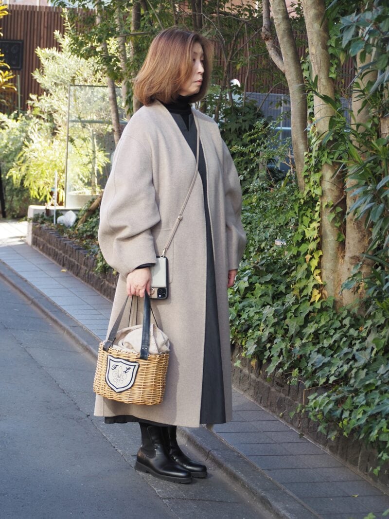 表参道のギャラリーに向かう途中のミュゲさんを直撃。色数をおさえたミニマルなスタイルに、かごバッグでさりげない遊び心をプラス。こうすることで、冬の装いがぐっと軽やかに。コートは中にニットを合わせても着膨れしない絶妙なボリューム袖が◎。「ユニクロ」のタートルネックと「リゼッタ」のワンピースはブラック×グレーでシックにまとめて。