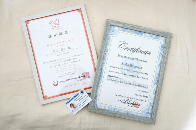 スウェーデン式ドッグマッサージセラピストとペットフーディストの認定書。
