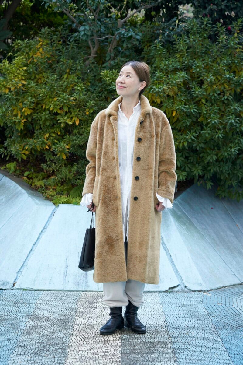 ウール素材のファーコートは、こっくりとしたベージュカラー。「重さはありますが着心地がよくてあたたかいです。リネンシャツのフリルをコートの袖口から見せます」と清水さん。女性らしいアイテムにスウェットパンツをミックスするワザにも注目!