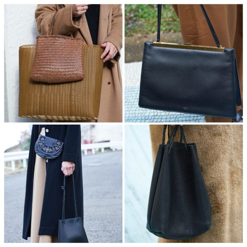 荷物が多い日は、大きめのかごバッグと小さいかごバッグを二つ持ちする清水さん。「かごは好きなアイテムで、冬にはレザーやリサイクルプラスチックにします」と清水さん。レザーバッグは、シューズに合わせて黒をそろえています。