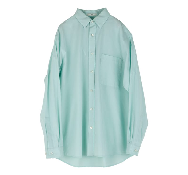 爽やかなグリーンが春らしいシャツを〈エイトン〉から。アメリカのスーピマコットンを兵庫・西脇の機屋でやや甘めに織り上げた、ピンオックスフォード生地を採用。襟先はボタンダウンながらボタンが隠れる仕様になっていて、工夫が光る。ゆとりのあるサイズ感だが、横からはすっきりと見えるパターンで、さっと羽織ればジャケット代わりにも。